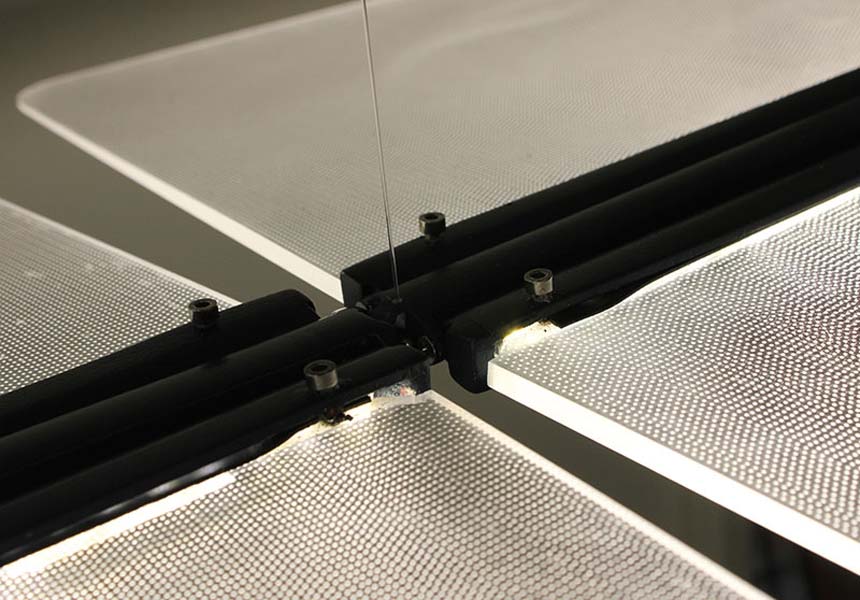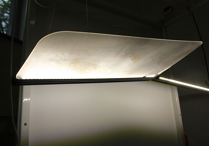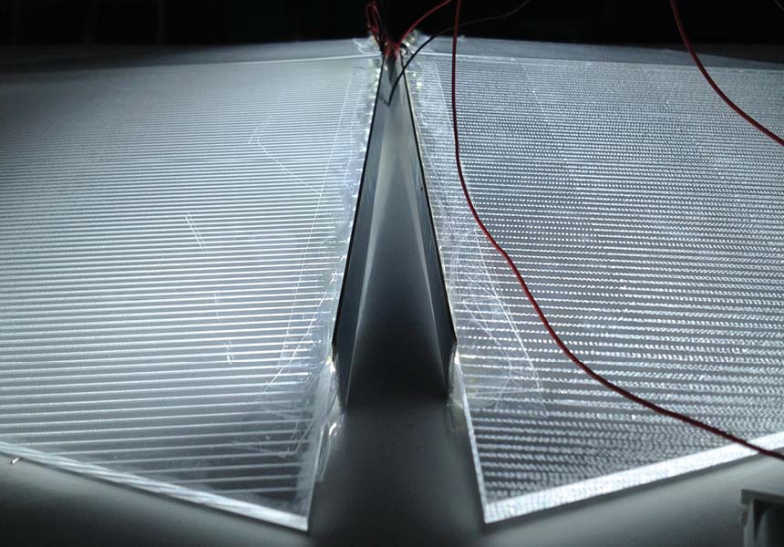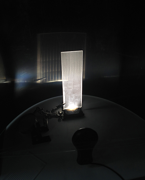 Um ein Gefühl für die hier angewandte Lichtleitertechnologie zu bekommen, wurden verschieden Experimente durchgeführt. Es wurden technische Ansätze in kleinen Modellen durchgespielt, aber auch unterschiedliche grafische Muster getestet, welche das Licht in den transparenten Acrylglaselemeten brechen. So wurden messbare Erkenntnisse über die Lichtstreuung der verschiedenen Konfigurationen gewonnen.